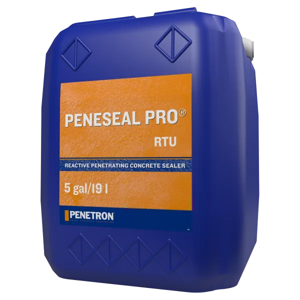 PENESEAL PRO™ (RTU) е реактивно, импрегниращо, течно покритие за бетон, готовo за употреба. Нанася се чрез пръскачка и образува защитен слой под повърхността на бетона, като го защитава от проникване на вода, уплътнява и запечатва капилярни пукнатини с ширина до 2 мм. Нанася се върху повърхности, изложени на високи температурни разлики. При пръскане върху добре почистена бетонна повърхност, продуктът взаимодейства с калциевия хидроксид в бетона и образува под-повърхностен гел. Този гел затваря и уплътнява порите, капилярите и пукнатините. При наличие на вода, продуктът запазва своята активност и запечатва бъдещите капилярни пукнатини, като защитава бетона от замърсяване, вода и нахлуване на хлориди. При подземни проекти, системата Penetron e доказано най-добрият избор.