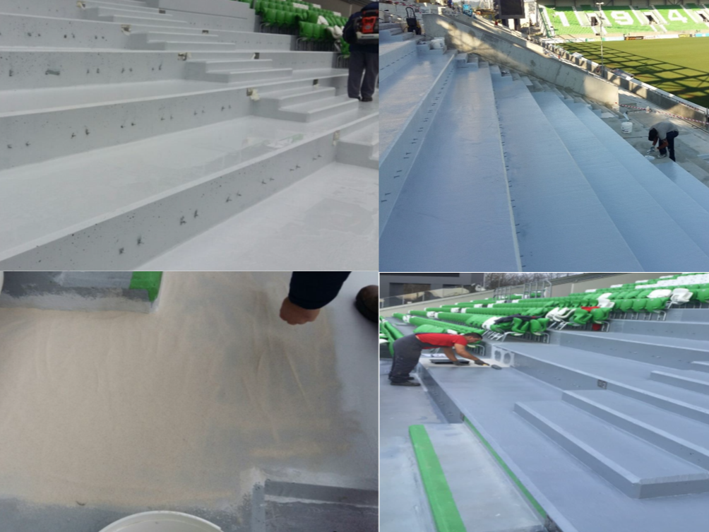 Малко преди официалното откриване на ремонтираната трибуна "Моци", се установява проблем с хидроизолацията, който води до течове в официалните стаи и съблекални под трибуната. За бързото и сигурно отстраняване на проблема бе използвана еластичната система Simp Coat 25 + високо, трафикоустойчиво, защитно покритие Penecoat PU - H. Така бе осигурена еластична защита, издържаща от -40 до +100 градуса, както и 100 % UV устойчивост.