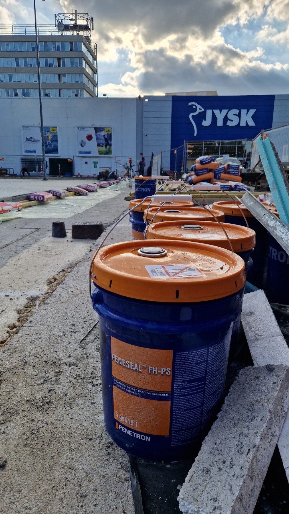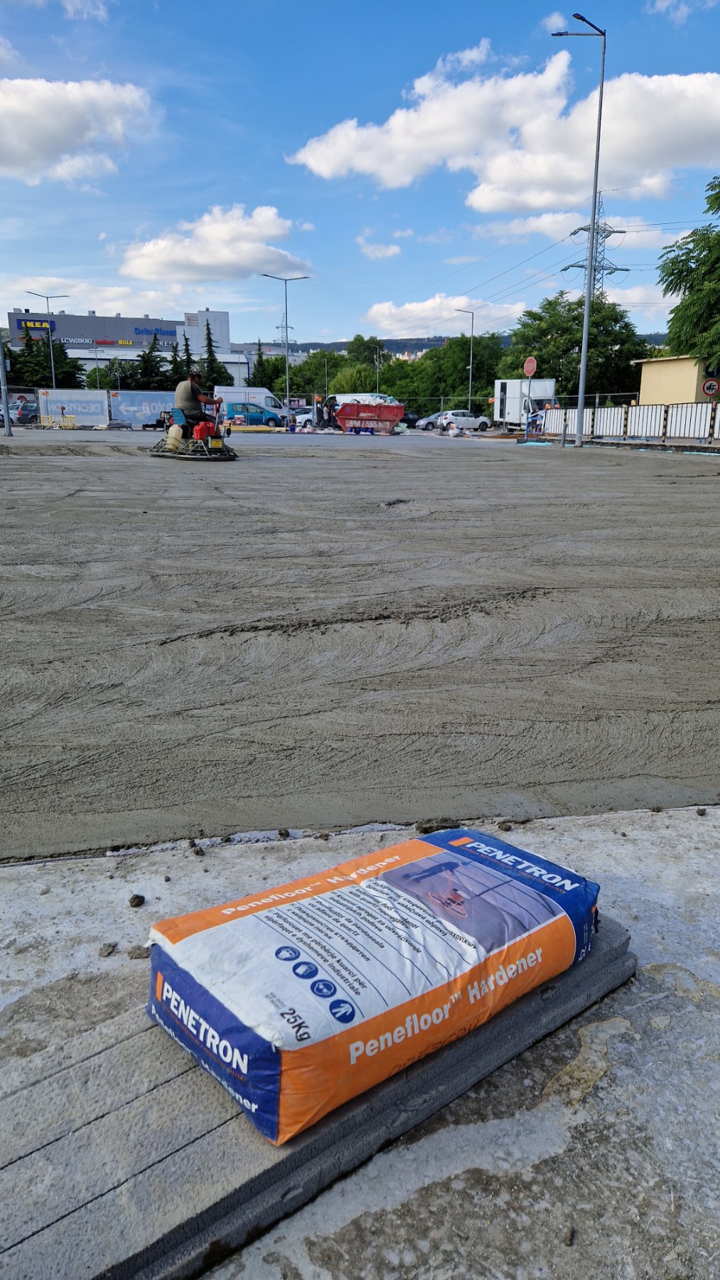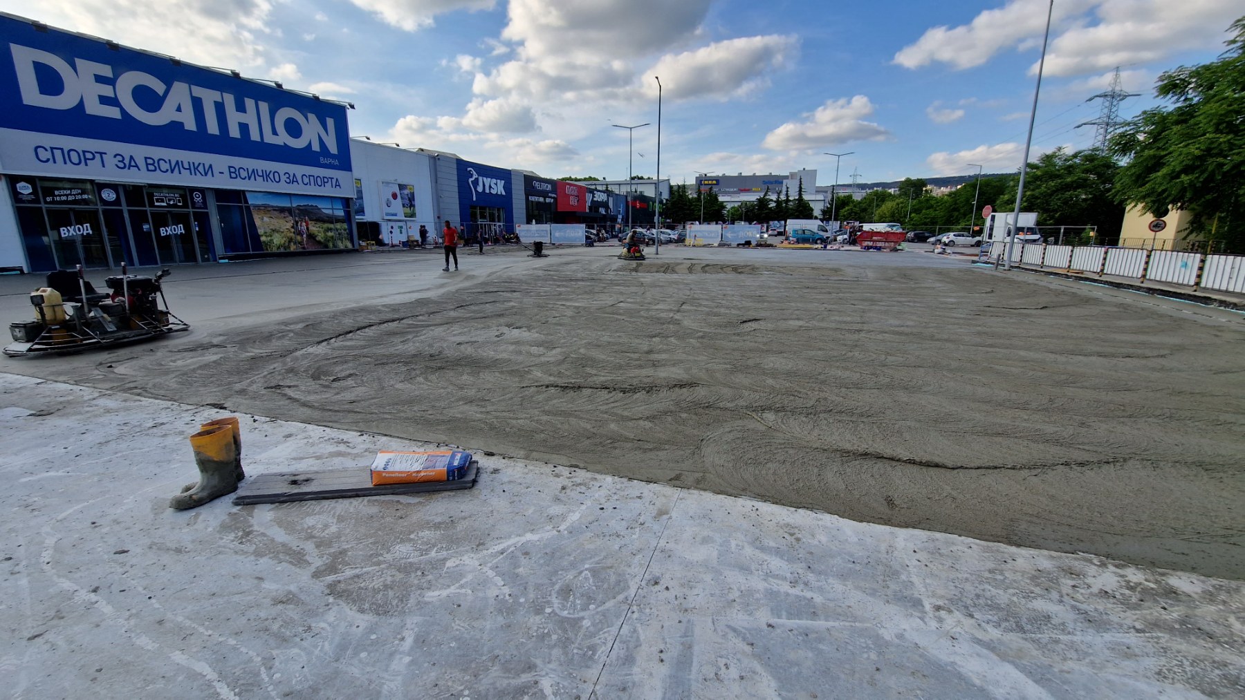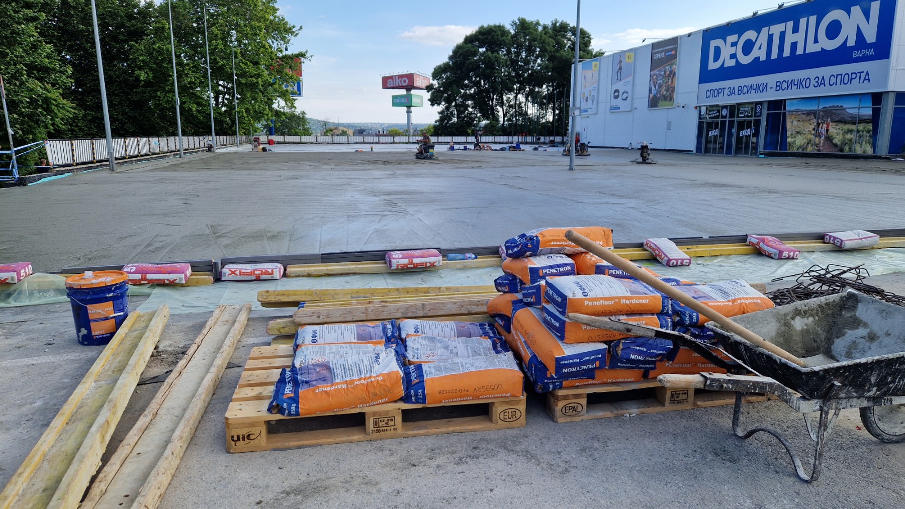 Шлайфан бетон на магазин "Decathlon" в гр. Варна, изпълнен по Сисемата PENETRON. Към бетона е добавен PENETRON ADMIX за хидроизолация и химическа защита. Преди стартиране на процеса по шлайфане на бетона със строителни хеликоптери е поръсен 2 кг/м2 повърхностен втърдител PENEFLOOR HARDENER. Няколко часа след завършването на процеса върху цялата работна площ е положен течният импрегнато PENESEAL FH - PS за допълнително заздравяване и предотвратяване на роненето и прахоотделянето на бетона.