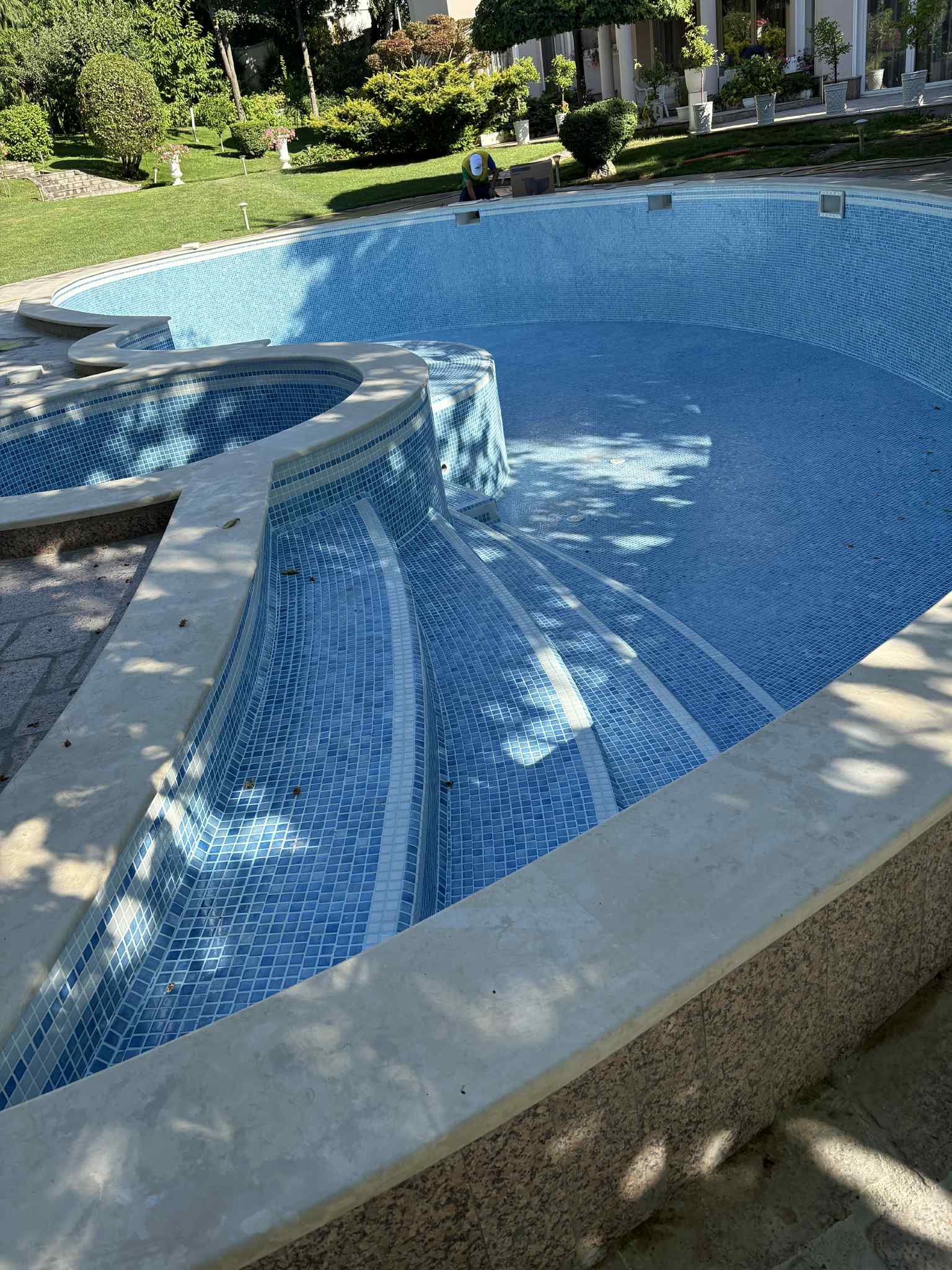 Цялостен ремонт и хидроиозолация на басейн. След премахване на компрометираните плочки, основата бе измазана с високоякостната ремонтна замазка PENETRON MULTIPATCH, към която бе добавена хидроизолационната добавка PENETRON ADMIX. Всички преминаващи комуникации (тръби) бяха обработени посредством репарационните кристализиращи материали PENETRON и PENECRETE MORTAR, като около тръбите бе поставена водонабъбваща лента PENEBAR SW 55 за уплътнение на фугата. Като финално покритие, преди полагането на новите плочки, основата бе обработена с еластичната двукомпонентна система SEAL COAT/PENECRYL ELASTIC. По този начин бе постигнато цялостно еластично решение за хидроизолация и защита.