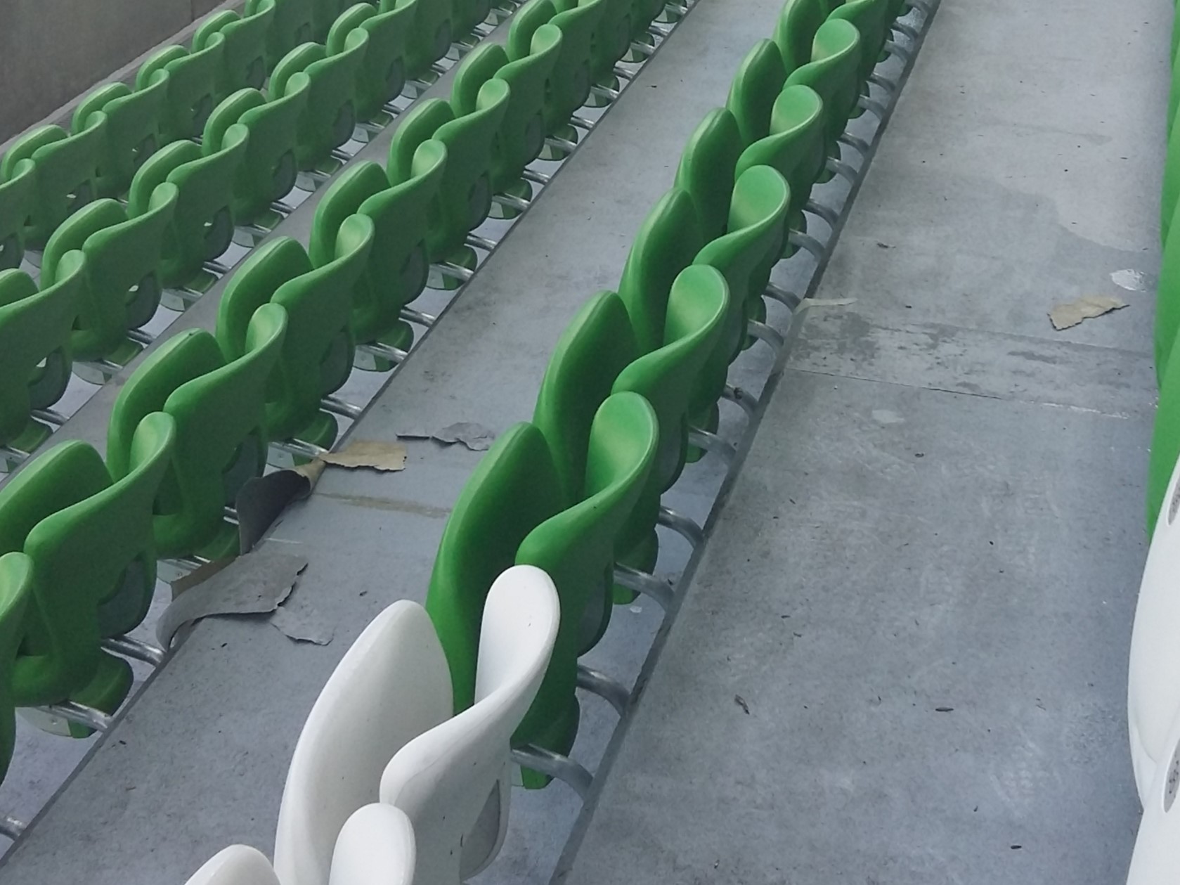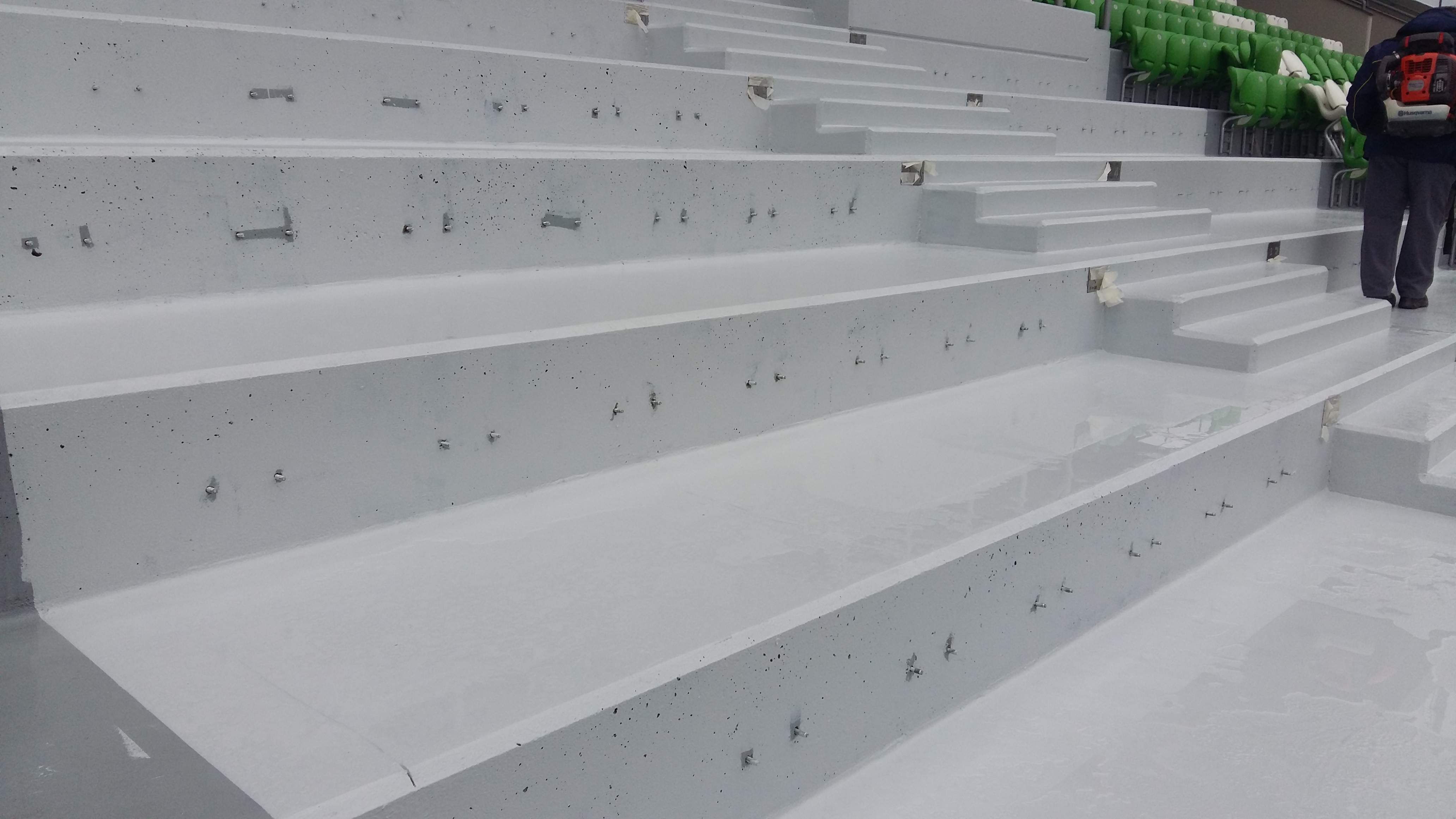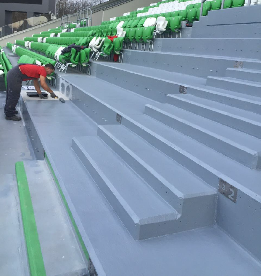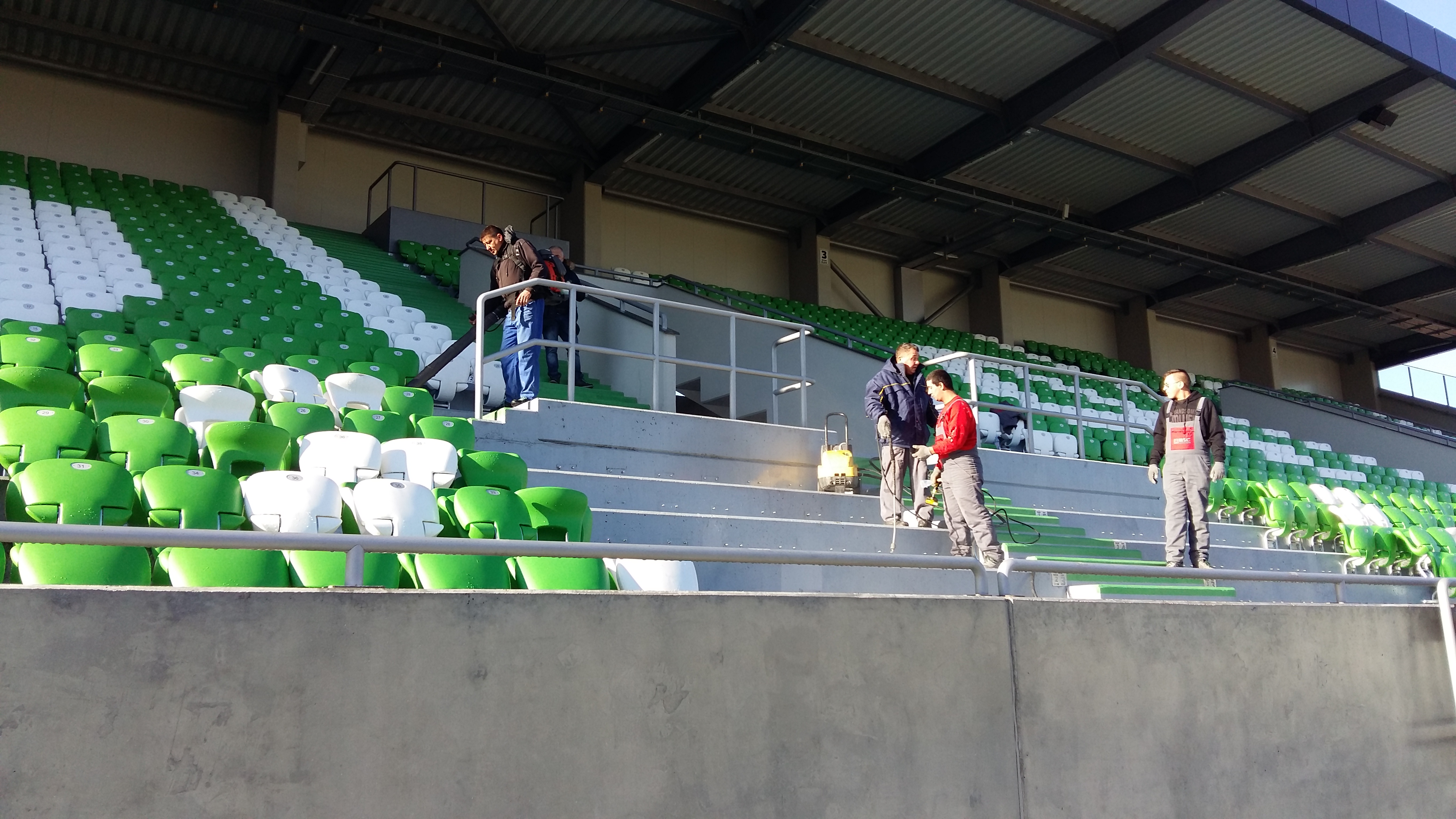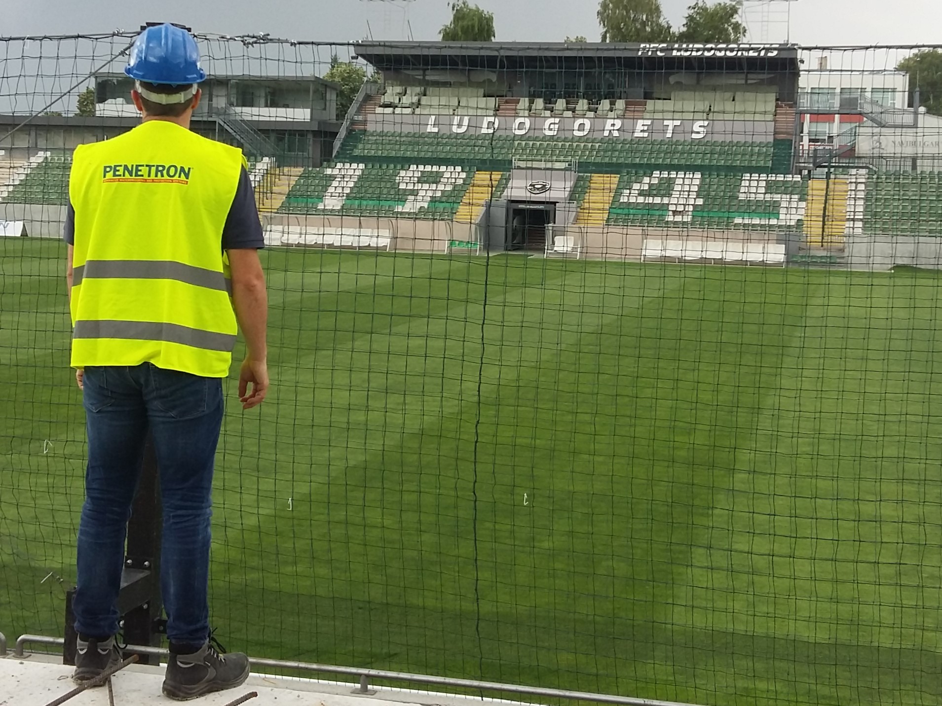 Малко преди официалното откриване на ремонтираната трибуна "Моци", се установява проблем с хидроизолацията, който води до течове в официалните стаи и съблекални под трибуната. За бързото и сигурно отстраняване на проблема бе използвана еластичната система Simp Coat 25 + високо, трафикоустойчиво, защитно покритие Penecoat PU - H. Така бе осигурена еластична защита, издържаща от -40 до +100 градуса, както и 100 % UV устойчивост.
