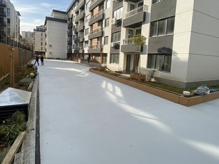 Ремонт на плоча по ситемата Penetron. За хидроизолирането на стоманобетонната плоча - покрив на сутеренно ниво, бе използвана еластичната система SiMP® COAT 25 - висококачествена, течна, еднокомпонентна, еластична, хидроизолационна мембрана + високо, трафикоустойчиво, защитно покритие Penecoat PU - H. Така бе осигурена еластична защита, издържаща от -40 до +100 градуса, както и 100 % UV устойчивост. Добавен бе и кварцов пясък за добра неплъзгаща повърхност. В този си вид системата о