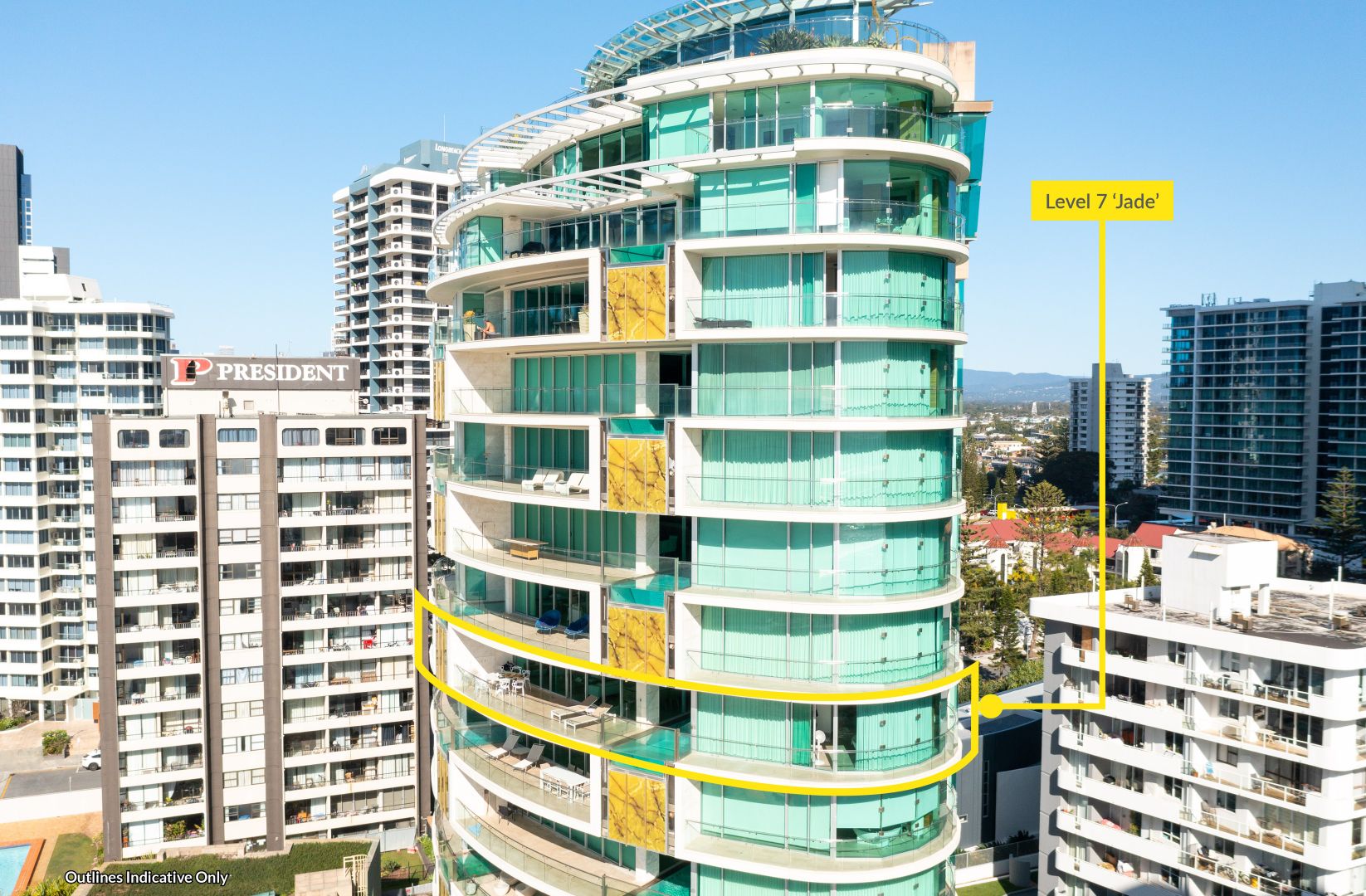 Разположен директно на брега на морето в Surfer’s Paradise, луксозните апартаменти Jade са уникални по дизайн с елипсовидна външна форма и само една единица на етаж.